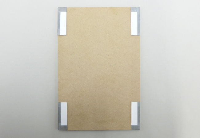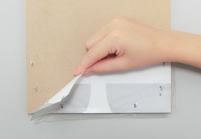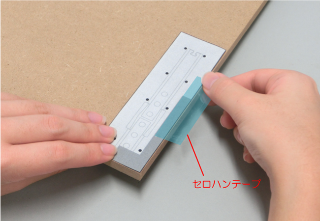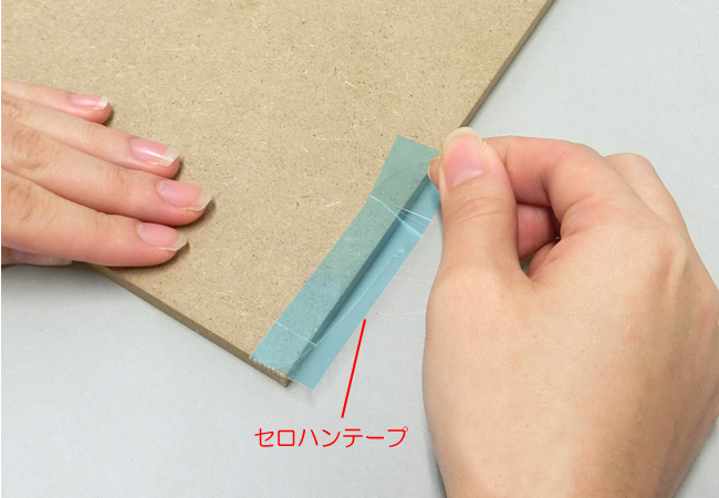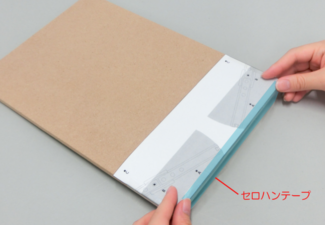 ①ジョイントパーツ用ガイドを切り取り、板の角にあわせてセロハンテープで貼ります。