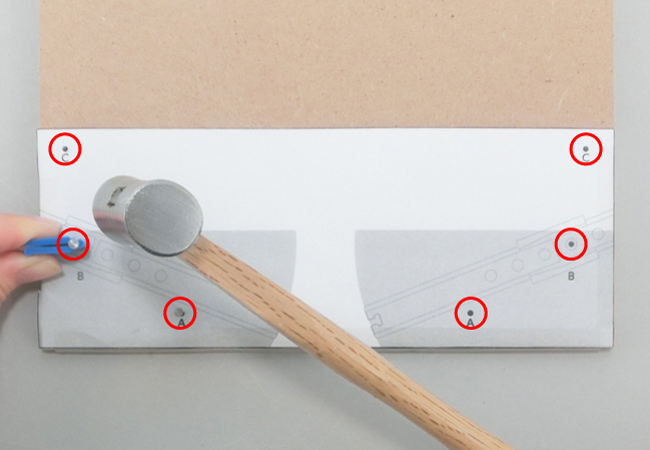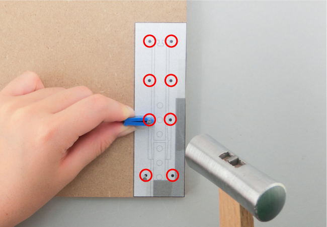 ②フリッパー用ガイドの黒い円6カ所に釘を打ちます。