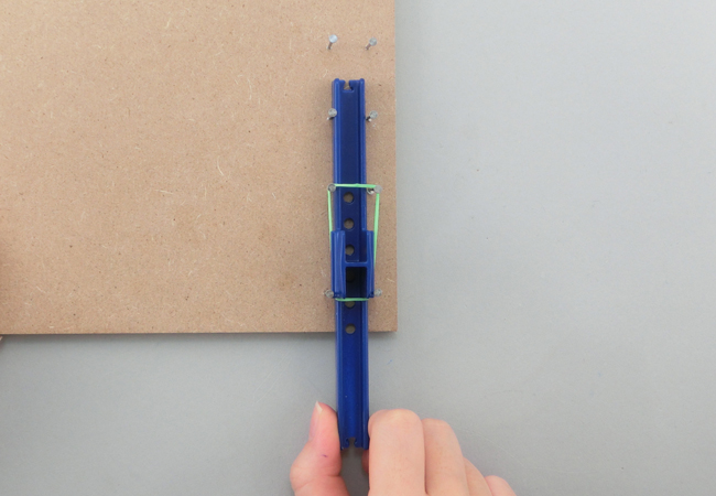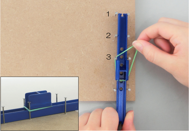 ⑤輪ゴムをジョイントパーツの突起と上から3つ目の釘にかけます。
