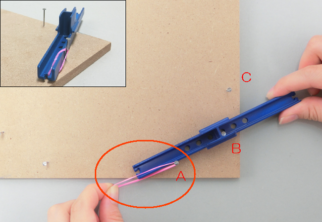 ④Bの位置の釘にジョイントパーツの右から3つ目の穴を通します。