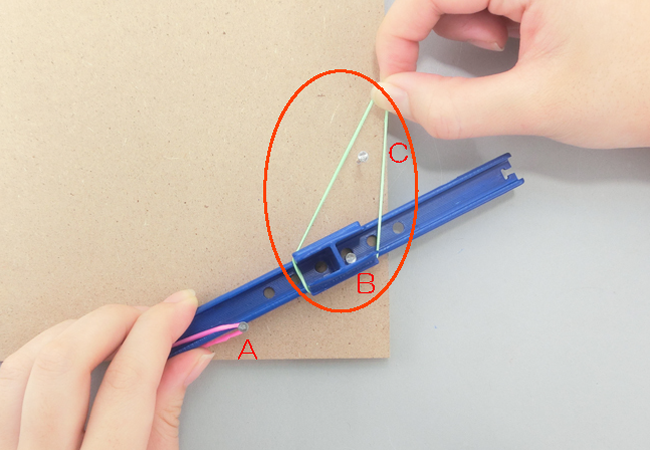 ⑥Cの位置の釘とジョイントパーツの突起に輪ゴムをかけます。