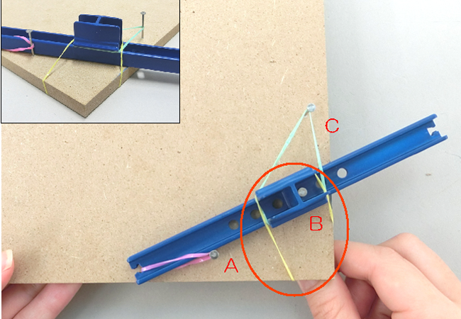 ⑤Aの位置の釘とジョイントパーツのスリットに輪ゴムをかけます。