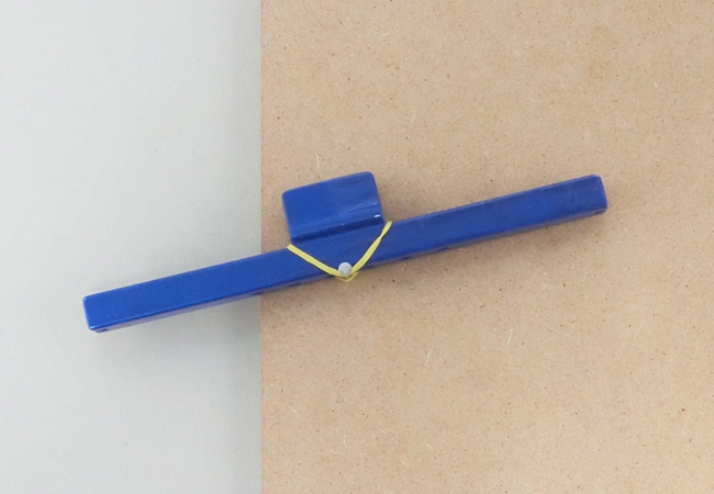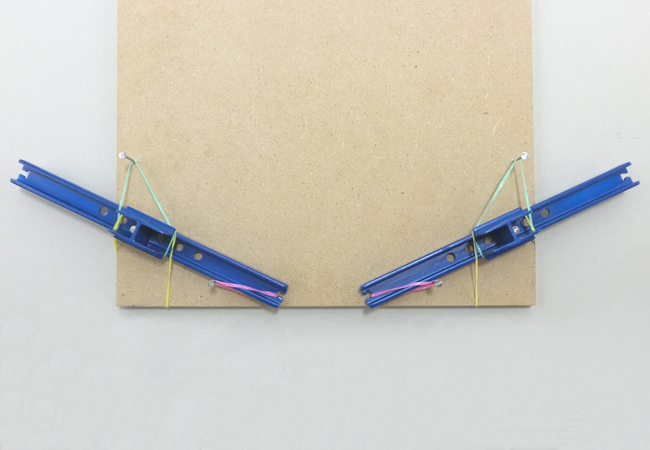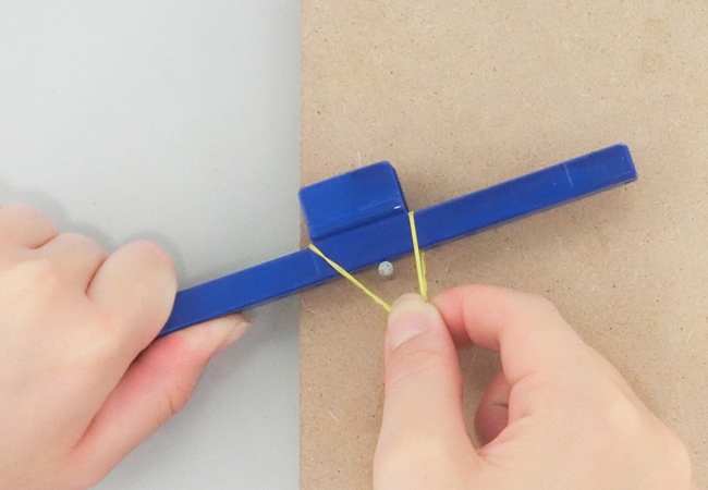 ⑦ジョイントパーツの突起と板の角に輪ゴムをかけます。