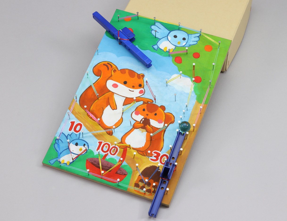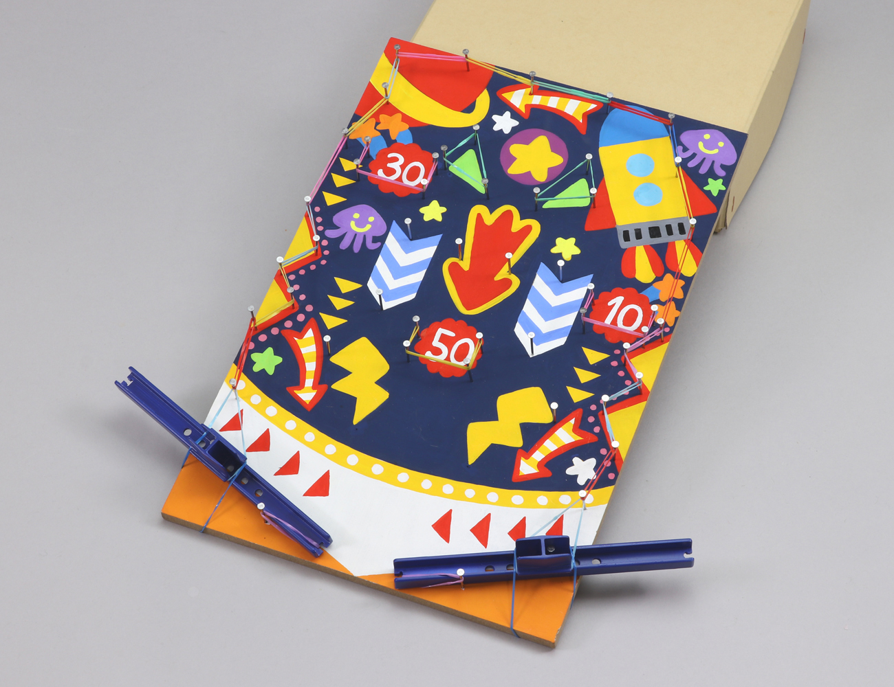 ジョイントパーツをフリッパーに使いました。ピンボールのような宇宙をイメージした背景でロケットや宇宙人を描いた作品にしました。