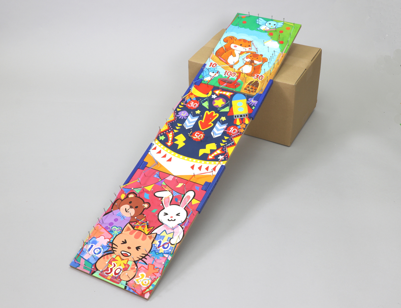 ジョイントパーツを発射台とシーソーに使いました。ポケットをつくって点数制度にして友達と楽しめるようにしました。