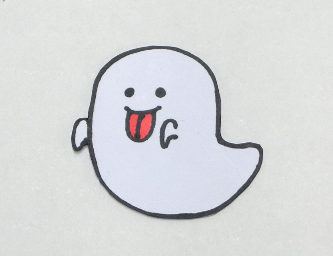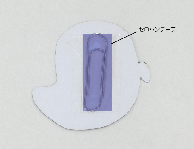 ①絵をかいた白画用紙の裏側にゼムクリップをセロハンテープで取りつけます。
