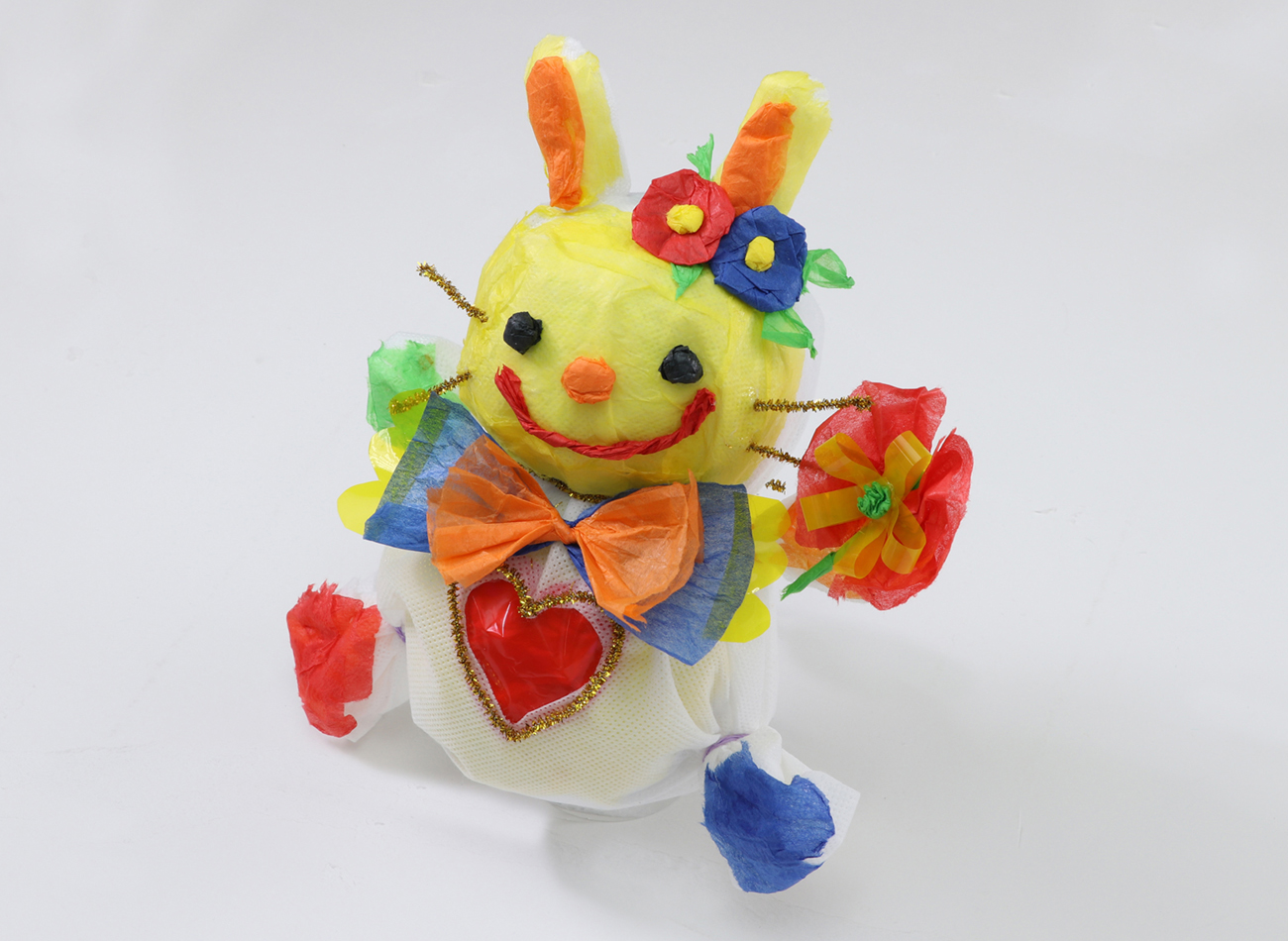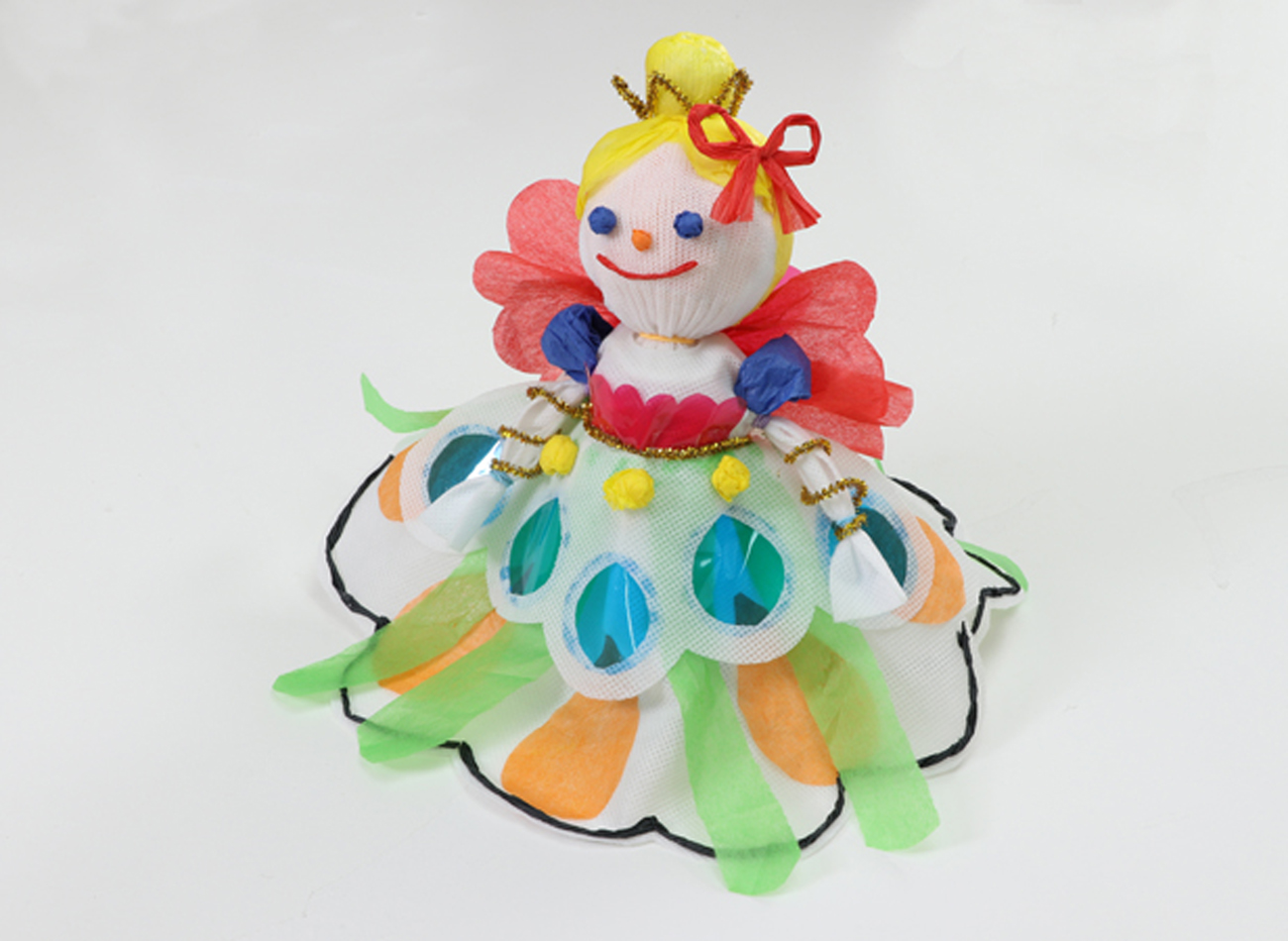 手袋で頭をつくり、不織布でドレスをつくりました。足の代わりにふんわり広がるスカートをつくることでボリュームのある作品になりました。