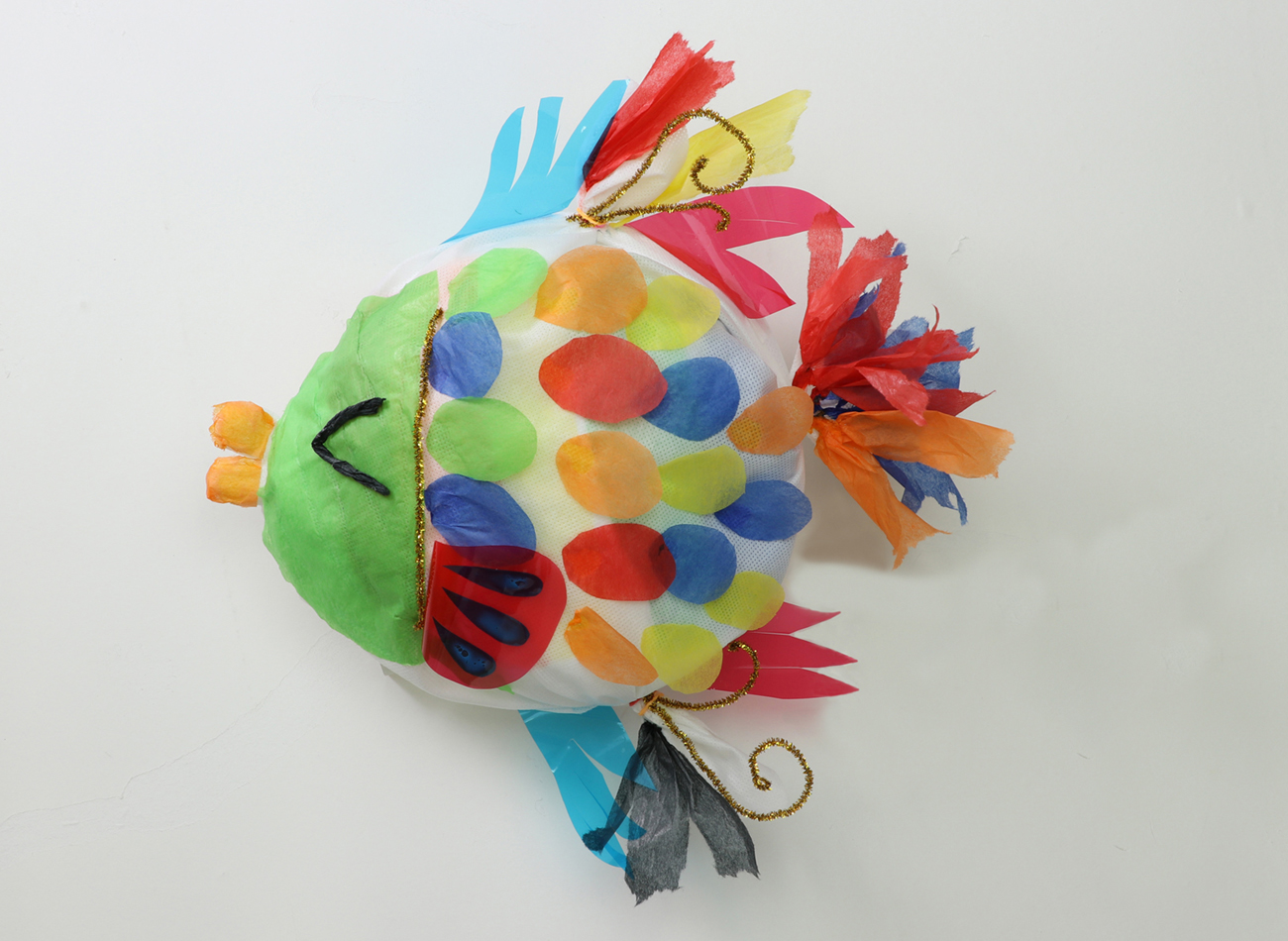 大きな魚を表現しています。おはながみやネオセロハンを不織布の上から貼ると、カラフルな作品をつくることができます。