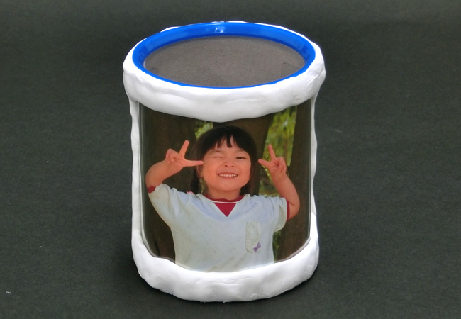 軽量ねんどをつけるポイント 軽量ねんどは厚紙とプラスチック枠につけます。 軽量ねんどをつけるときは、中から手で支えて厚紙や透明板がへこまないようにつけましょう。 写真を入れる部分が軽量ねんどで隠れてしまわないようにしましょう。 上下のプラスチック枠のつなぎ目や透明板と紙のつなぎ目に軽量ねんどをつけると作品を補強することができます。