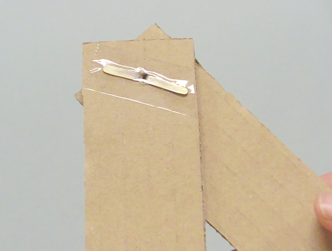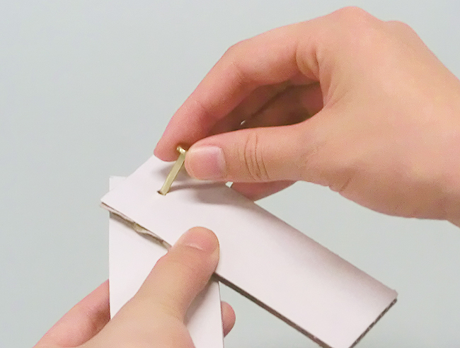 割りピンのつけ方 割りピンを使って作品をつなぎます。 ①きりや穴あけパンチであけた穴に、割りピンを通します。 ②割りピンの足を根元から両側に開きます。 ③割りピンの端でけがをしないように、開いた割りピンの足を、上からセロハンテープでとめます。