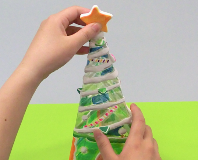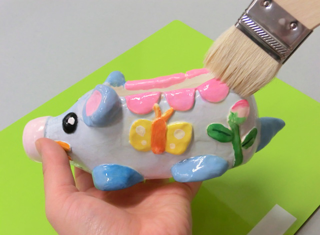 作品をよく乾かしたあと、絵の具やカラーペンなどで色をぬります。乾かしたあとに色をぬるとあざやかな色に仕上げることができます。