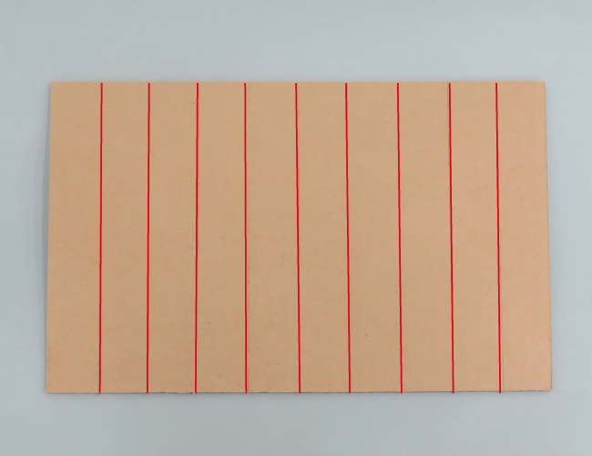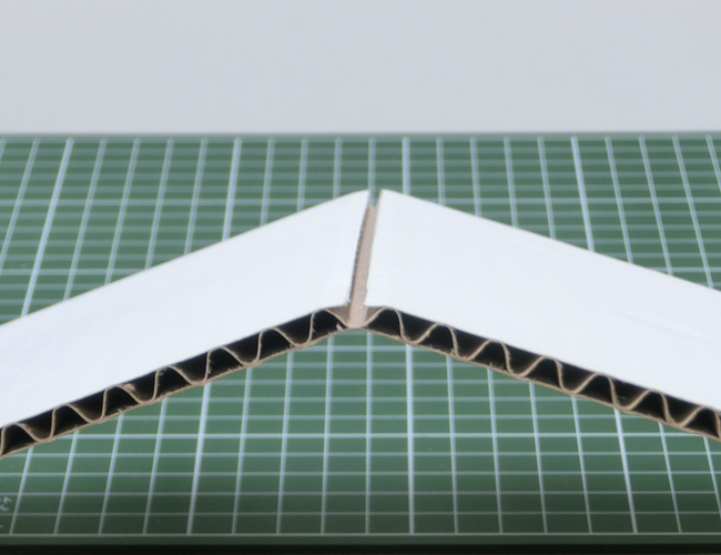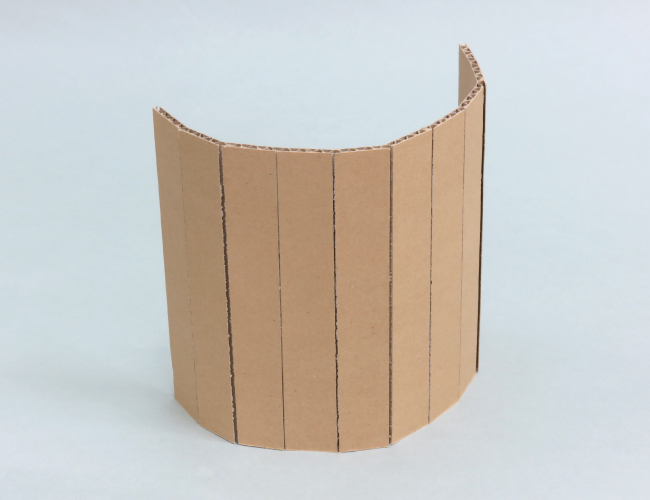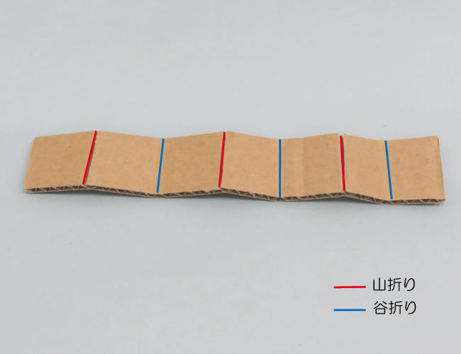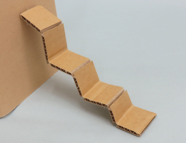 ダンボールの折り方 1.折り方の基本 2.折り方の工夫 1.折り方の基本 折る位置に切り込みを入れておくことで、きれいに折ることができます。 ①ダンボールカッターなどを使い、片側の紙を残して切り込みを入れます。 ②切り込みにそって折ります。 折ったダンボールは立たせることができます。 2.折り方の工夫 ・曲面 切り込みを細かく入れて折ると、曲面をつくることができます。 ・階段 交互に山折りと谷折りにすることで、階段をつくることができます。 ①切り込みを入れて、交互に山折りと谷折りにします。 ②形を整えると、階段の完成です。
