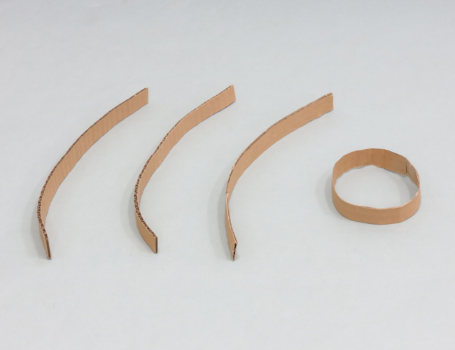 用意するもの:帯状のダンボール(3本)、貼り合わせて輪にしたダンボール(1個)
