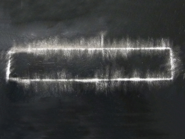 ①砂消しゴムスクラッチボードの下に定規を置き、そのふちを上からこすると、定規の輪郭線を描くことができます。