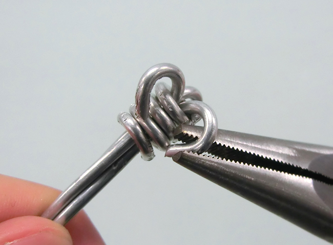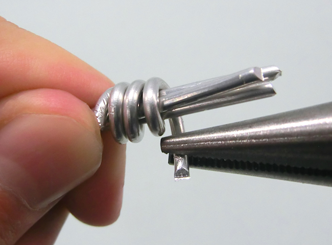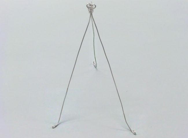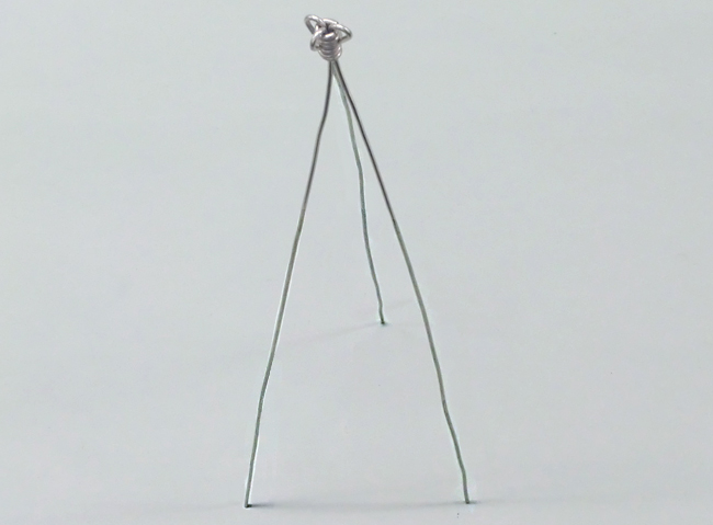 タワーの立たせ方 1.骨組みをつくる 2.自立させる 1.骨組みをつくる タワーの脚にする同じ長さの針金を3~4本と、短い針金を1本用意します。 ①脚にする針金をたばね、先が1~2cmほど出る位置に短い針金をしっかり巻きつけます。 ②針金の先を丸めます。 あらかじめ、先から1~2cmほどの位置をセロハンテープで固定しておくと、作業がしやすくなります。 2.自立させる ①脚を開きます。 ②脚の先を外側に丸く曲げると、タワーが安定します。 ③バランスが良くなるように曲げ方や脚の広げ方を調節しましょう。