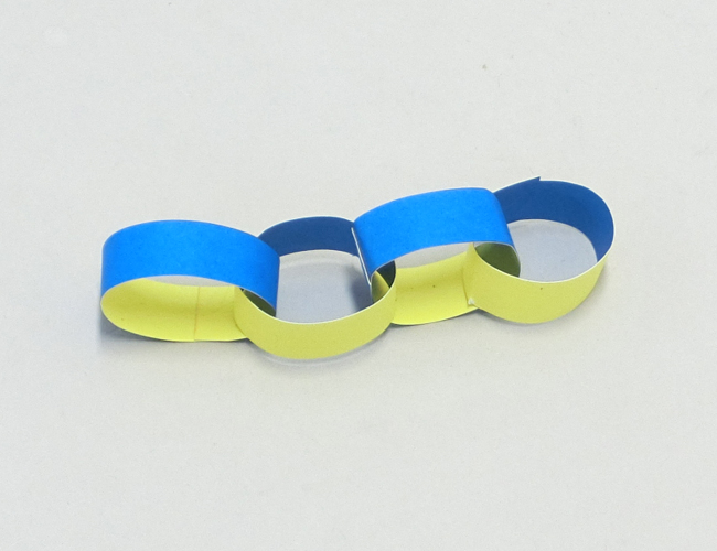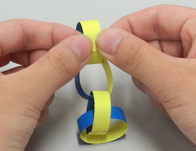 ②切ったカラーフォーメーションの端を、のりで貼り合わせます。できた輪に次のカラーフォーメーションを通し、つないでいきましょう。