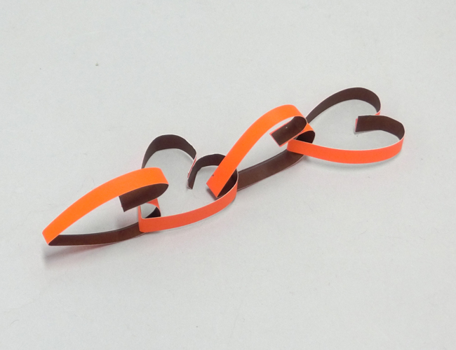 ④できた輪に次のカラーフォーメーションを通し、つないでいくと、ハートの輪飾りができます。