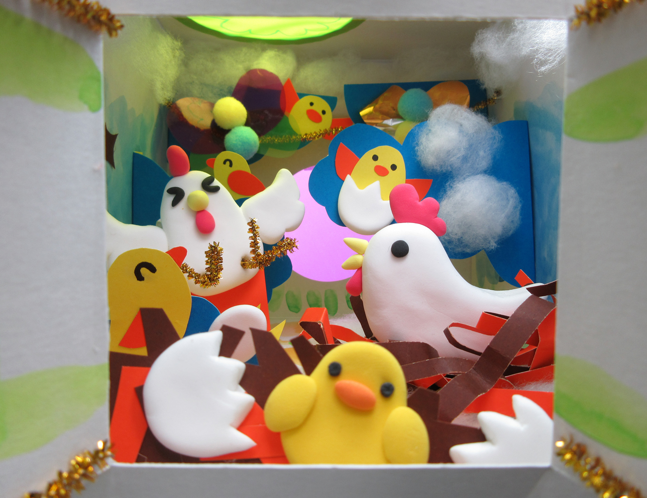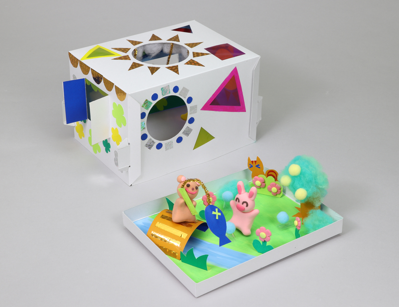 ふたに飾りを置くことで、広さを感じられる作品をつくりました。箱を被せたときと、被せていないときで、作品の表現の違いが楽しめます。
