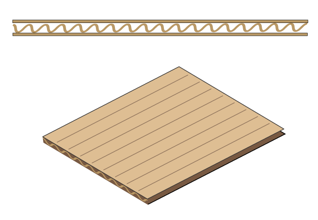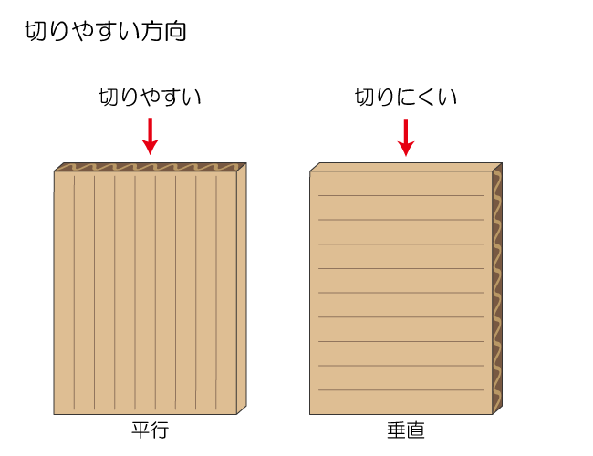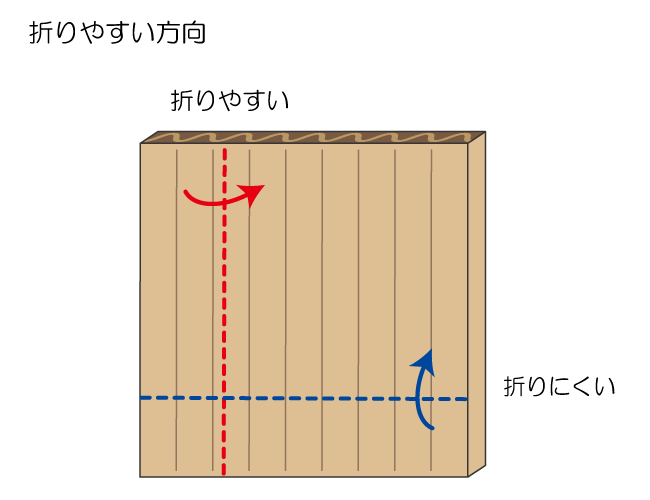 ダンボールの特徴 1.構造 2.方向による違い 1.構造 ダンボールの特徴をいかして、使い方やつくり方を工夫しましょう。 両面ダンボールは、紙と紙の間に波型の紙をはさんでできています。 片面ダンボールは、1枚の紙に波型の紙がついています。 2.方向による違い 切りやすさや折りやすさは、ダンボールの目に対する方向によって変わります。 平行方向は切りやすく、垂直方向は切りにくくなります。 平行方向は折りやすく、垂直方向は折りにくくなります。