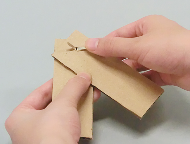 割りピンのつけ方 割りピンを使って作品をつなぎます。 ①きりや穴あけパンチであけた穴に、割りピンを通します。 ②割りピンの足を根元から両側に開きます。 ③割りピンの端でけがをしないように、開いた割りピンの足を、上からセロハンテープでとめます。