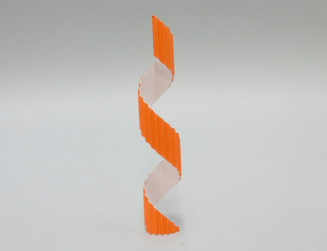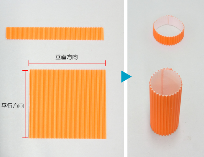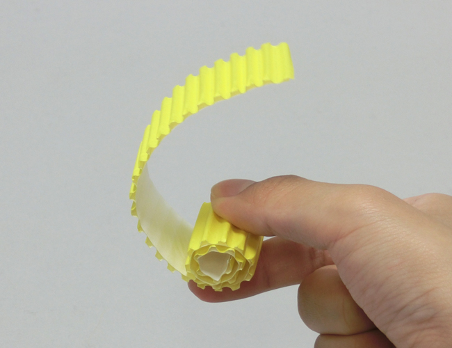 ダンボールの目に対して斜めに切ることで、丸めてらせんをつくることができます。