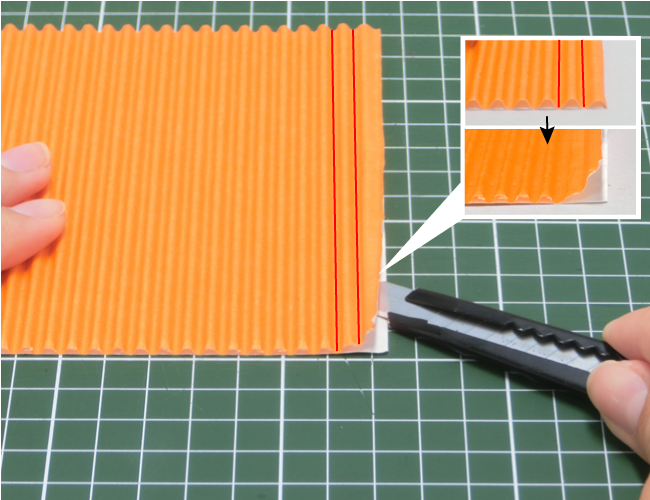 ②端から2つほど波目を平らにして、のりしろをつくります。カッターナイフの刃を寝かせて、波目の根元に切り込みを入れましょう。