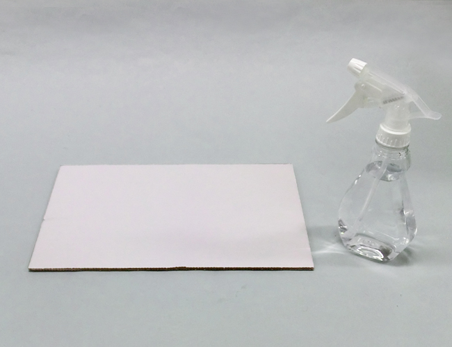 ①霧吹きなどでダンボールに水を吹きかけてぬらします。ダンボールに水がしみ込むまで待ちましょう。