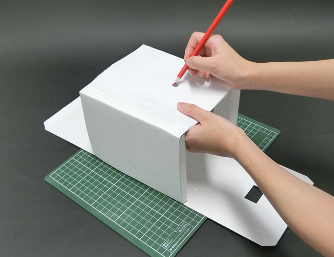 ②穴を抜きたい面を手で支え、鉛筆などをつかって穴を抜きます。