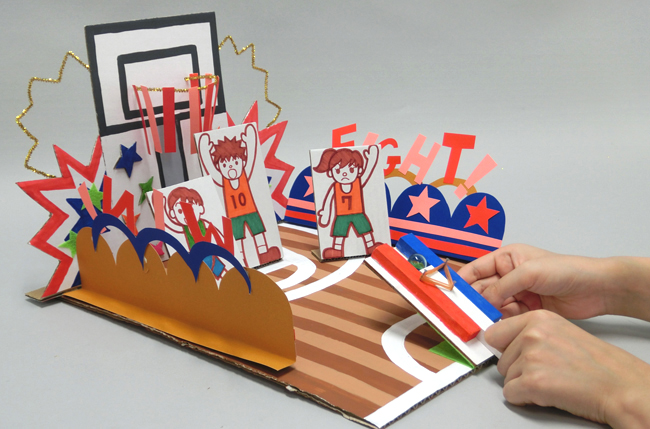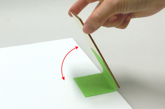 ③土台の下側にフェルトシールで発射台板を貼りつけます。このとき、発射台板と土台の間に1.5cmほど余裕を持たせます。