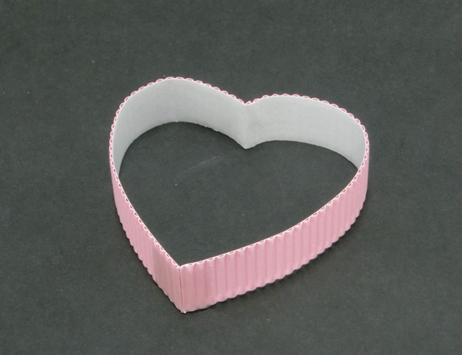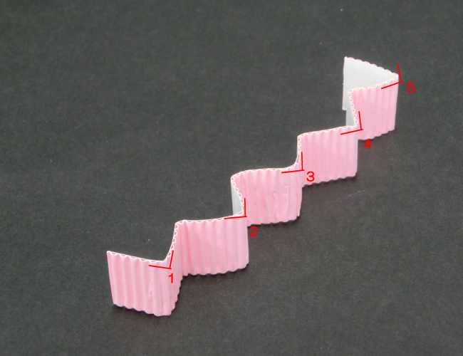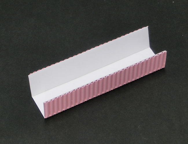 ①パステル片面ダンボールの折り線3つ分の帯を、好きな長さに切ります。両側を折り線1つ分ずつ内側に折り、壁をつくります。