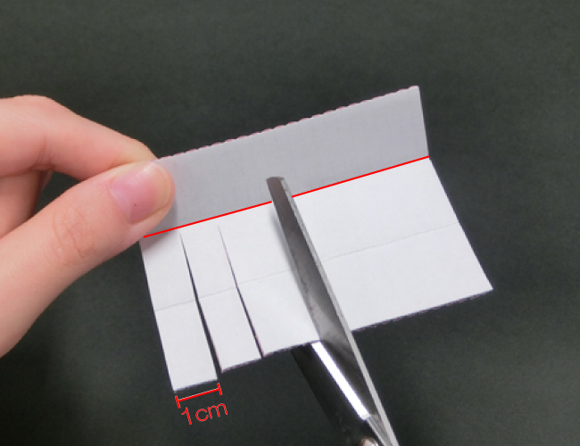 ①はじめに直線コースをつくり、片側の壁だけを残して赤線まではさみで幅1cmずつ切り込みを入れます。
