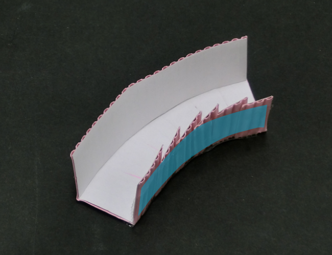 ③切り込みを入れた側の壁を順に立たせてからセロハンテープでしっかり貼りつけると、曲線コースの完成です。