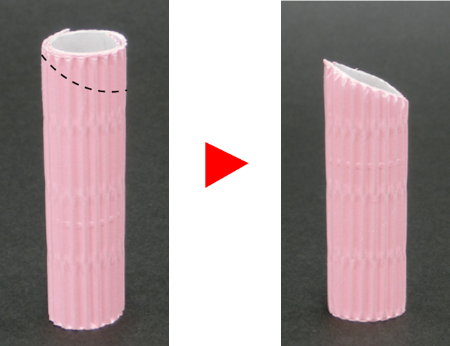 ①パステル片面ダンボールでつくった円柱を点線にそって斜めに切ります。