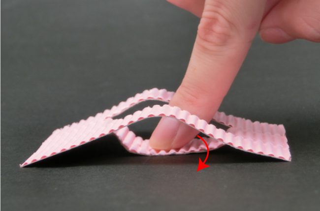 ②指で真ん中のパステル片面ダンボールの目をつまみます。