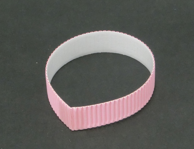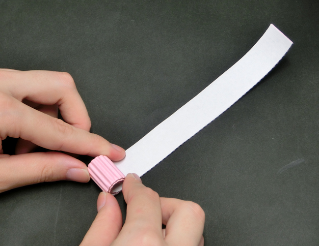 ①パステル片面ダンボールの帯を、平らな面を内側にして端から巻きます。端を木工用接着剤やねん着テープでとめましょう。