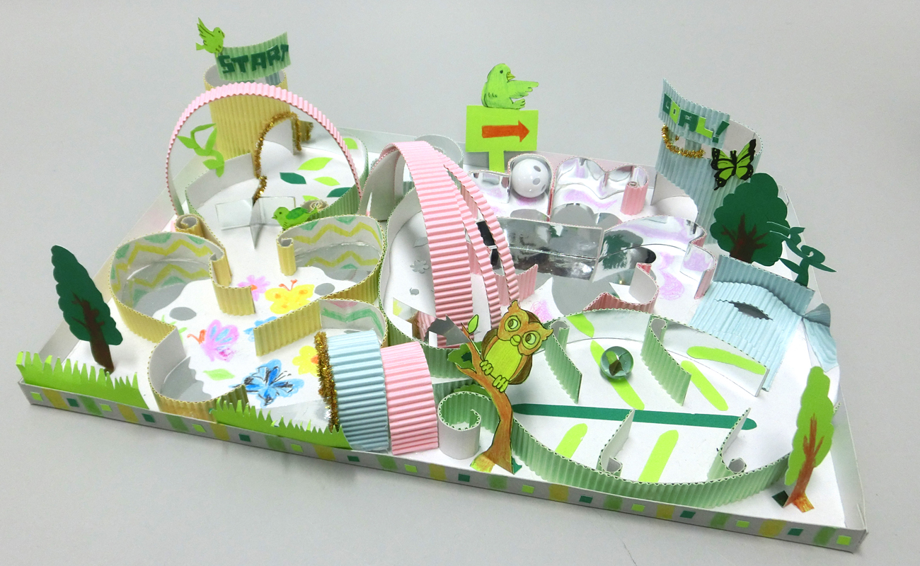 パステル片面ダンボールやミラー工作紙の使い方によって、いろいろな作品をつくることができます。コースや仕掛けを自由に置いてオリジナルの作品をつくりましょう。