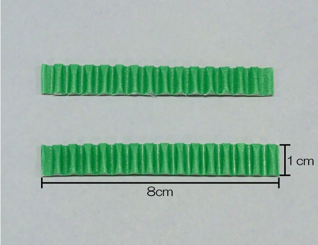 ①タテ1cm、ヨコ8cmに切ったカラーダンボールを2本用意します。カラーダンボールの目の向きが垂直になるように切りましょう。