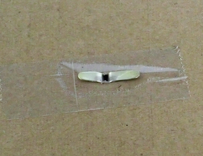 ⑦片面白ダンボールの裏で割りピンの足を根元から両側に開き、セロハンテープでとめます。
