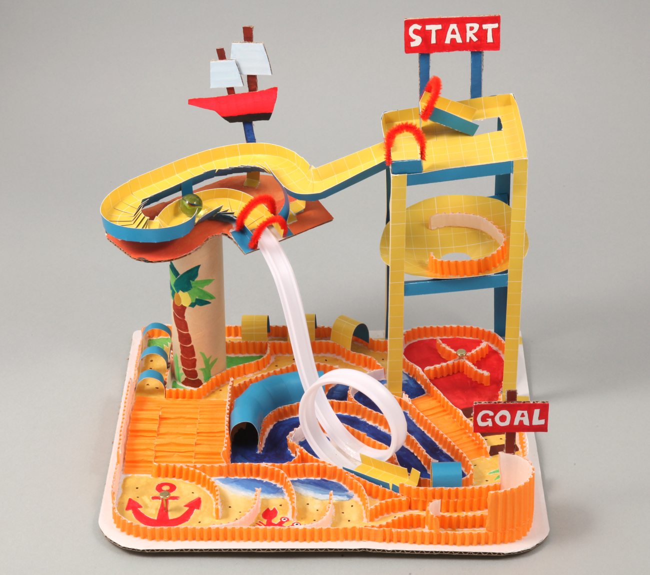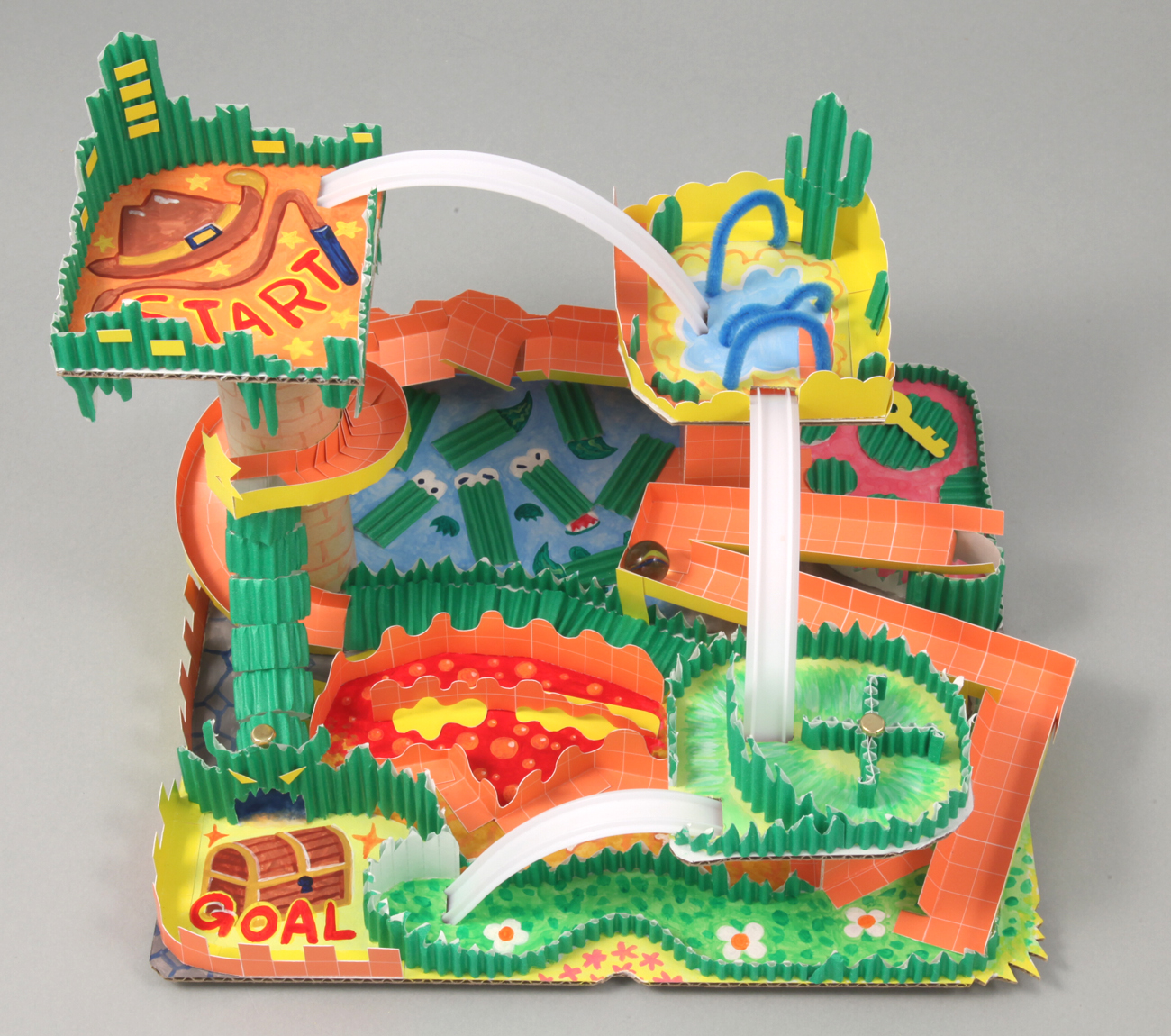 片面白ダンボールとカラー方眼紙で柱のある台をつくり、レールをつなげて、それぞれの台を渡っていく作品に仕上げました。