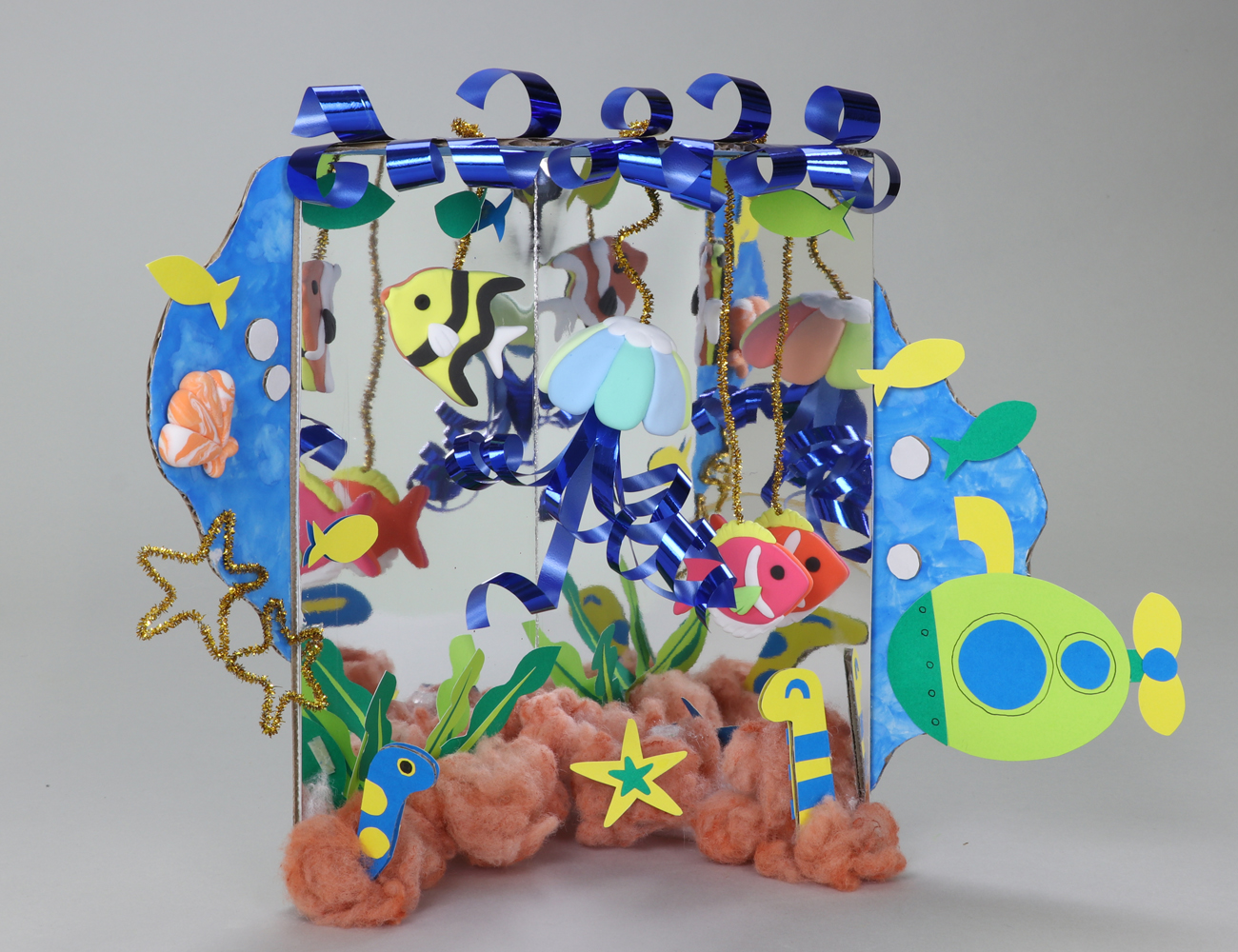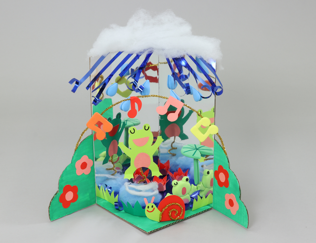 作品例 土台を変えれば様々な形の作品がつくれます。 『カエルの合唱隊』高さ28cm/セット内容のみ使用ミラーシートを使用して水たまりや雨を表現した作品です。 『海の中の世界』高さ25cm/セット内容のみ使用台紙を逆さに使用して、モールを吊り下げることで海の中の世界を表現しました。