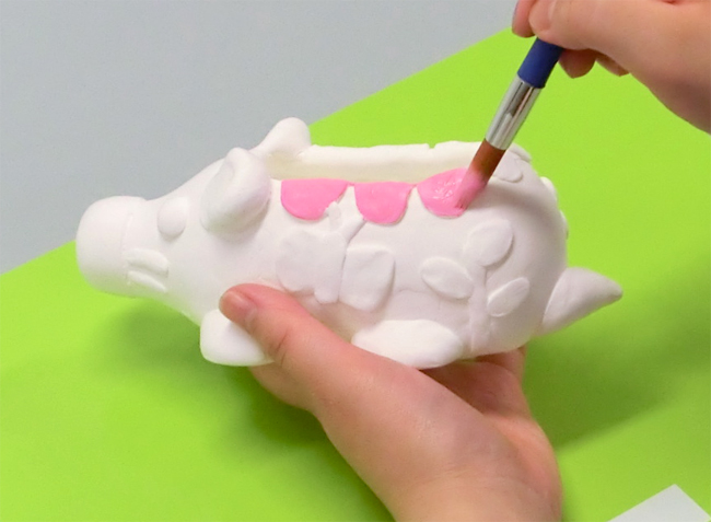作品をよく乾かしたあと、絵の具やカラーペンなどで色をぬります。乾かしたあとに色をぬるとあざやかな色に仕上げることができます。
