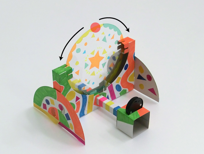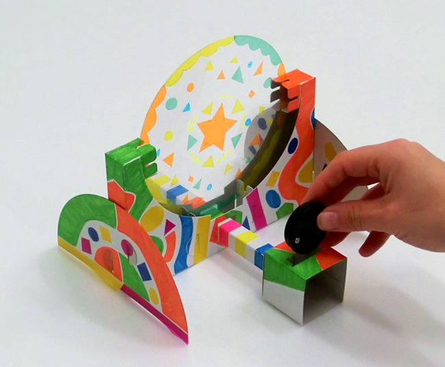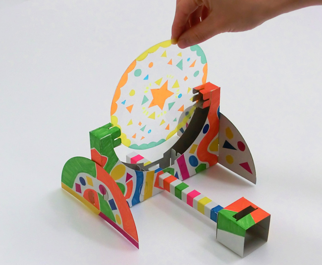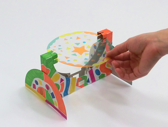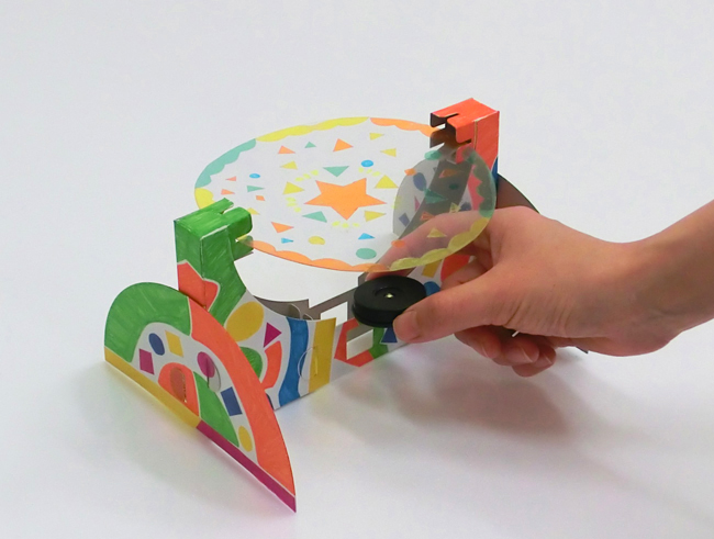 小さな紙を本体の前にかざして動かすと、映し出した模様の一部を切り取ることができます。