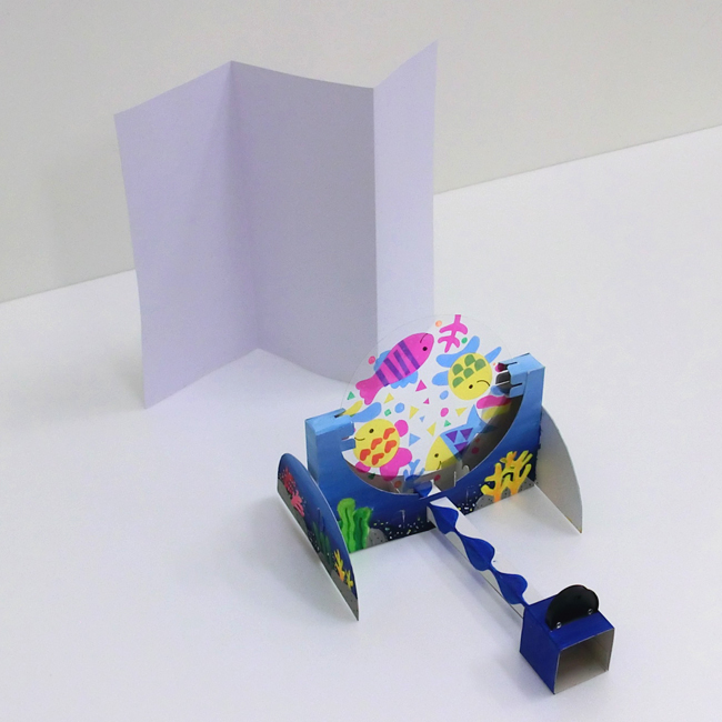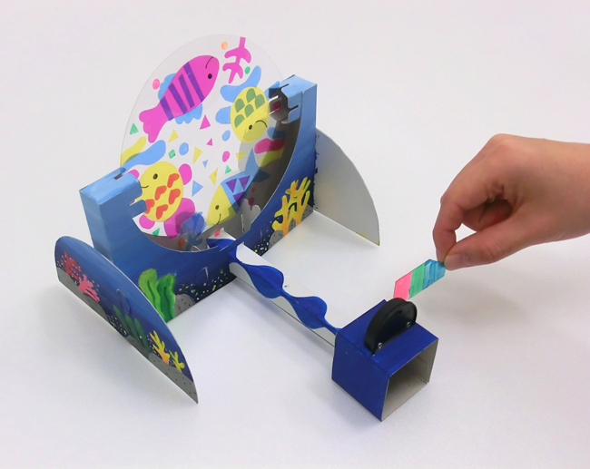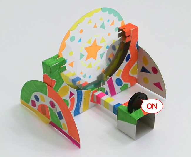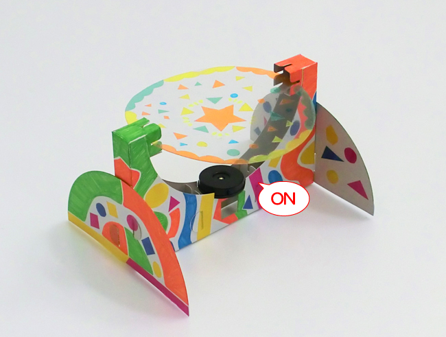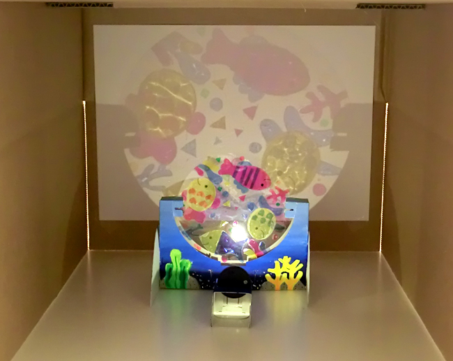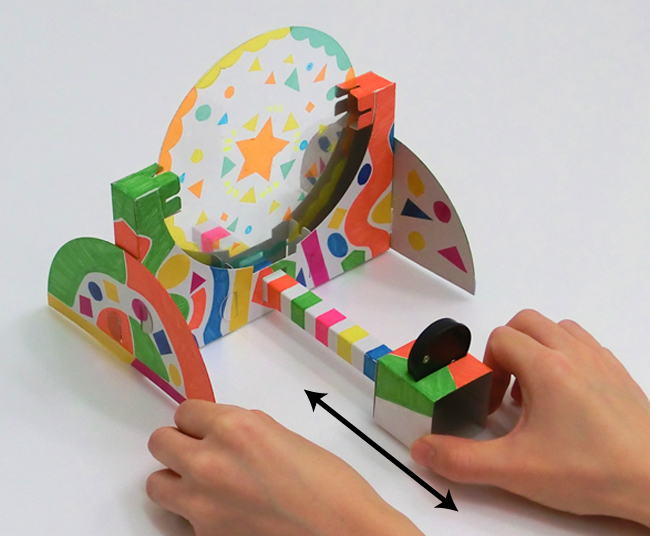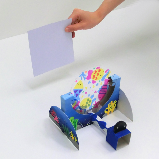③色をぬったものをLEDコインライトの前にかざして投影し、左右に動かします。