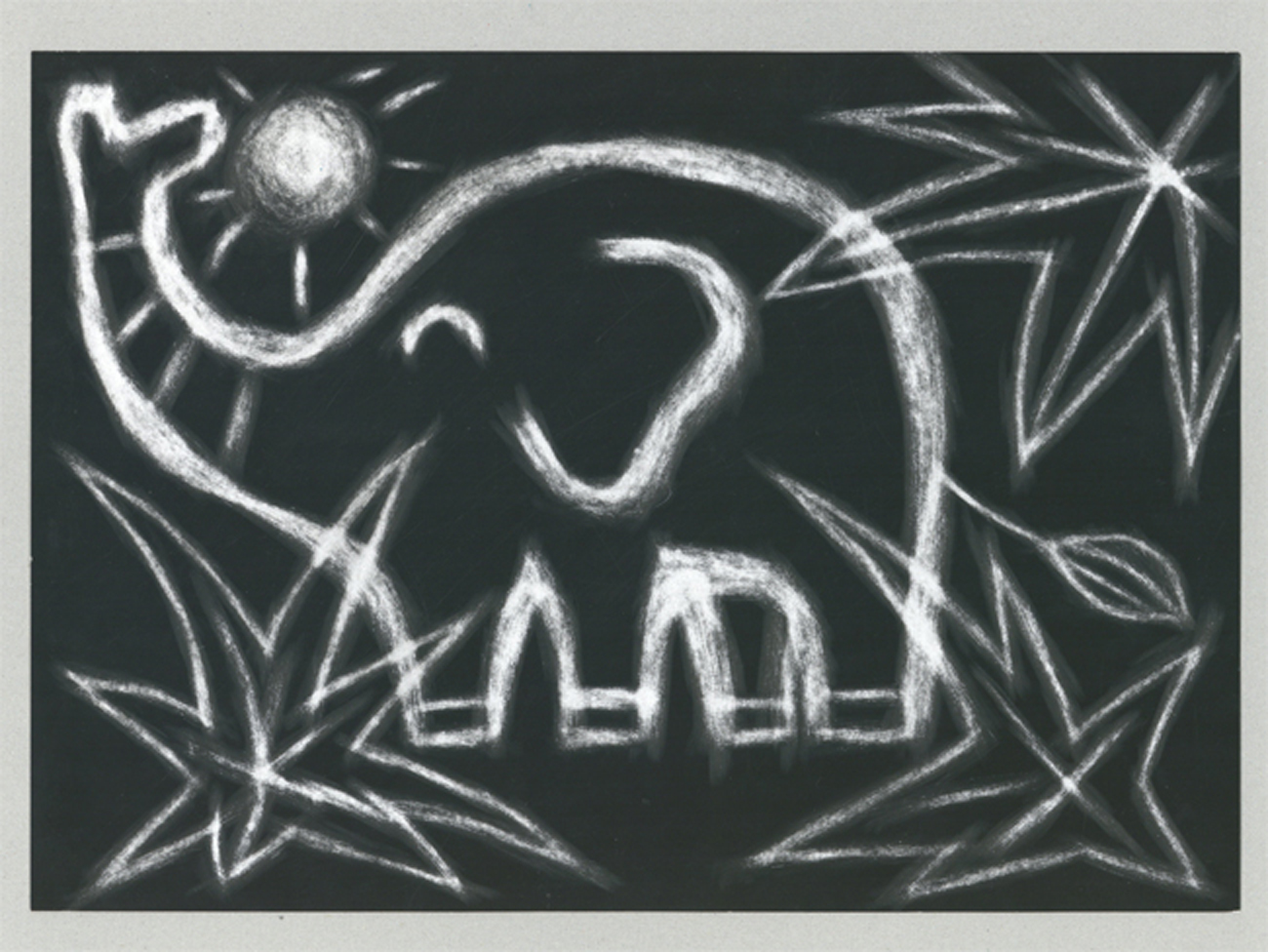 ゾウを太い線、葉を細い線で描くことによって、ゾウの大きさを強調しています。