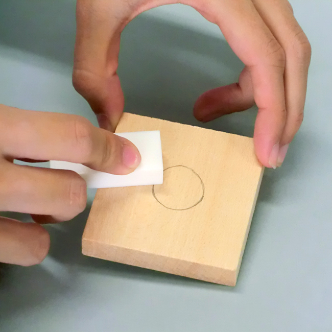 木片に絵や模様などを描いて絵の具で色をぬるときは、鉛筆で下絵を描きましょう。