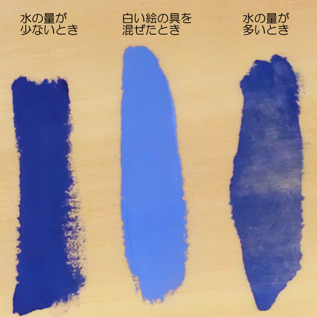 絵の具の水の量を変えたり、白い絵の具を混ぜたりすることで、色のイメージが変わります。