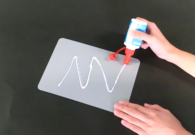 ①スチール白板の灰色面に木工用接着剤をつけます。