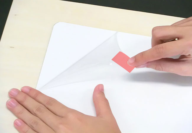 ③作品が完成したら、表面の透明シートをはがします。透明シートの端にセロハンテープをつけて引っ張ると、はがしやすくなります。