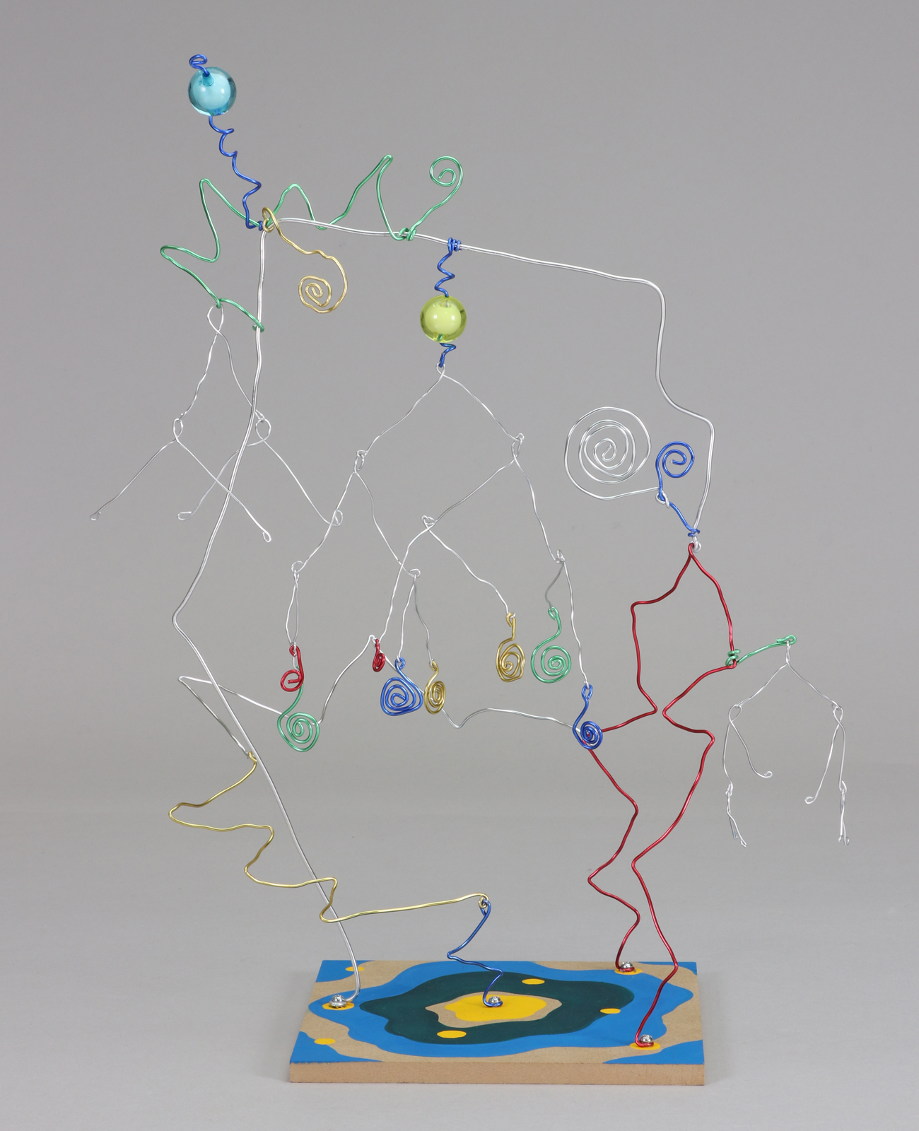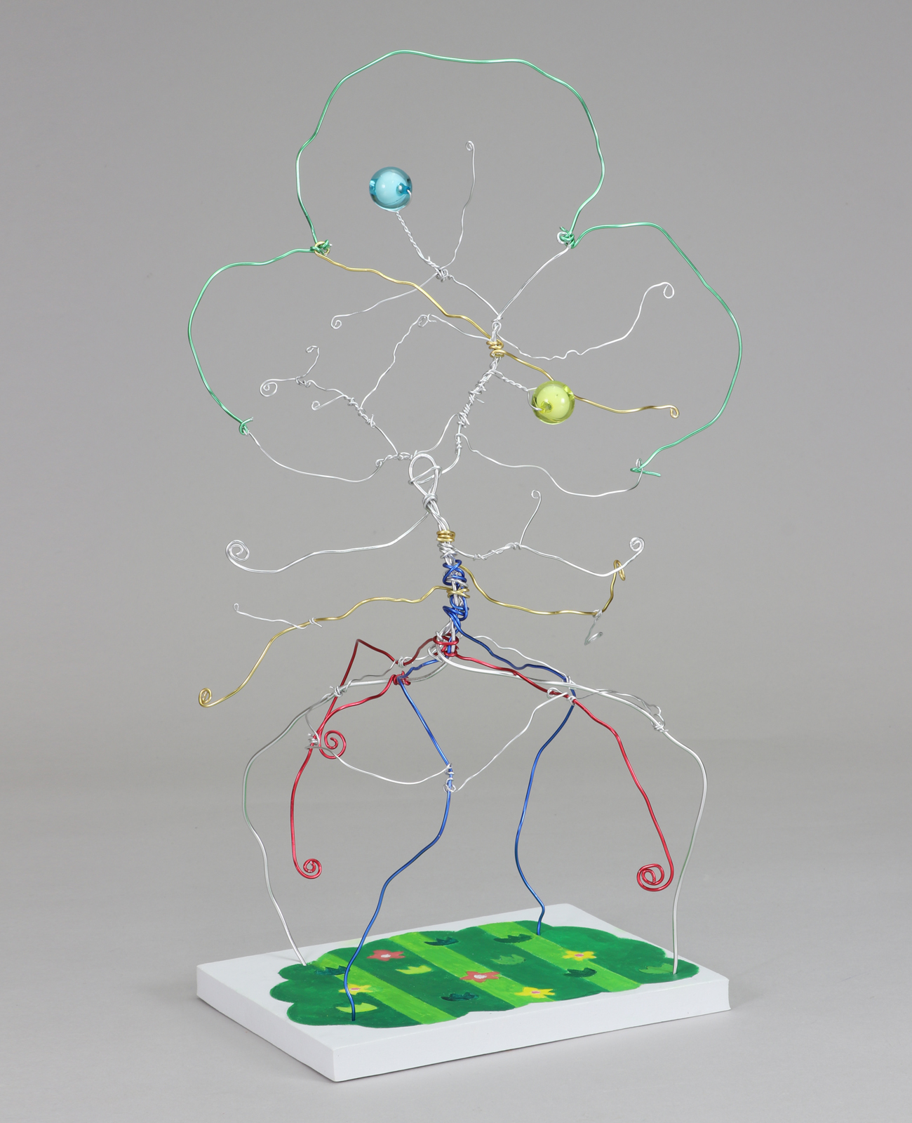 くるくる巻いたカラーワイヤーとビー玉で星を表現しました。揺れる飾りをつけるなど、いろいろな技法を盛り込んだ作品です。