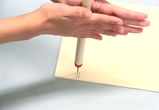 ②直角に切れるように角になる部分にきりで穴をあけます。